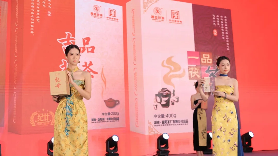 在發(fā)布儀式上,與會領(lǐng)導(dǎo)和專家共同啟動推桿,隨著金沙傾瀉而下,"紀廿"新品正式亮相,象征著湘益茯茶開啟新的發(fā)展征程。隨后,一場別開生面的新品模特走秀吸引全場目光。身著典雅服飾的模特手捧"紀廿"新品,以優(yōu)雅的姿態(tài)展示這款傳承與創(chuàng)新相結(jié)合的茯茶珍品,傳統(tǒng)茶文化與現(xiàn)代時尚在此完美交融,凸顯出新品的獨特魅力。