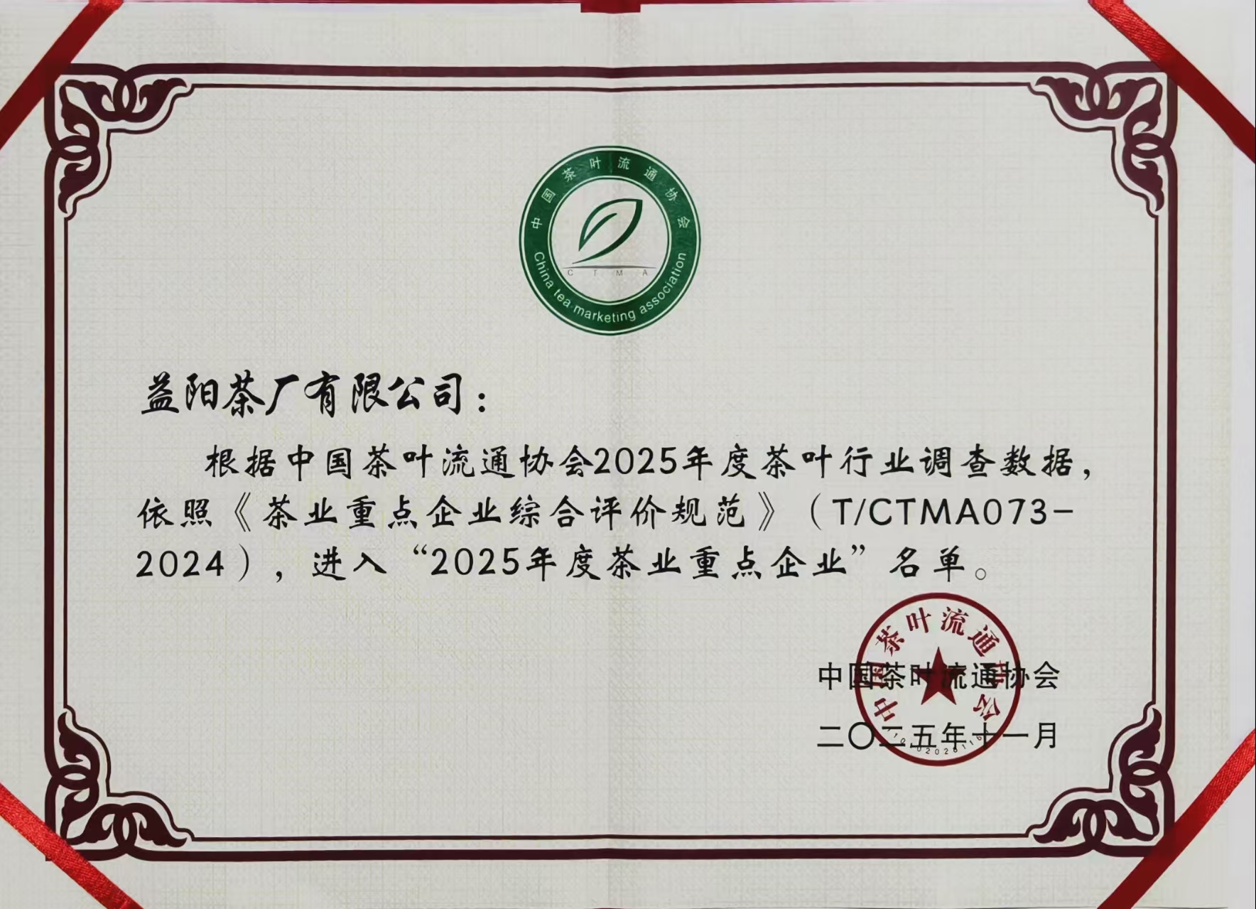 益陽茶廠有限公司榮獲“2025年度茶業(yè)重點(diǎn)企業(yè)”稱號